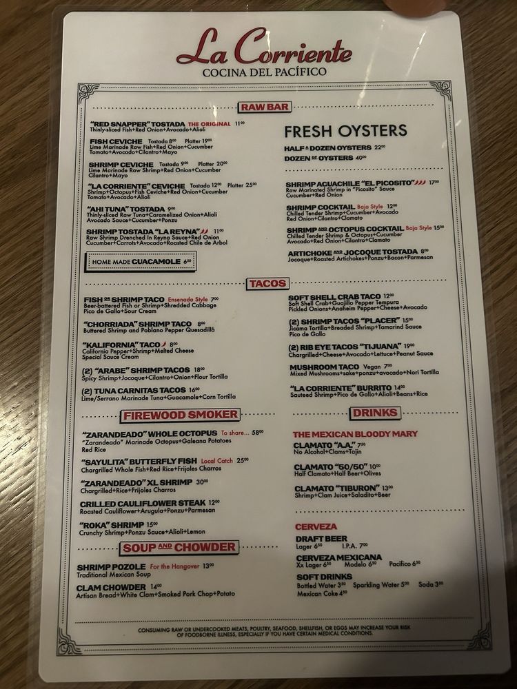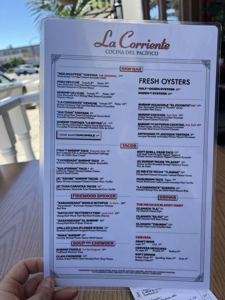 Located at 456 Pearl Street in San Diego, La Corriente La Jolla specializes in seafood cuisine. With a range of offerings and amenities such as outdoor seating and waiter service, this restaurant provides a cozy dining experience. One of the standout dishes, as mentioned by customers, is the Red Snapper Tostada. Alongside this, the Ahi Tuna Tostada and the Arabe Shrimp Tacos are also highly recommended. Customers praise the attentive service and the fresh, flavorful seafood dishes. While some reviewers mention minor issues, such as soggy tacos, overall, La Corriente La Jolla is known for its excellent food quality and inviting ambiance.